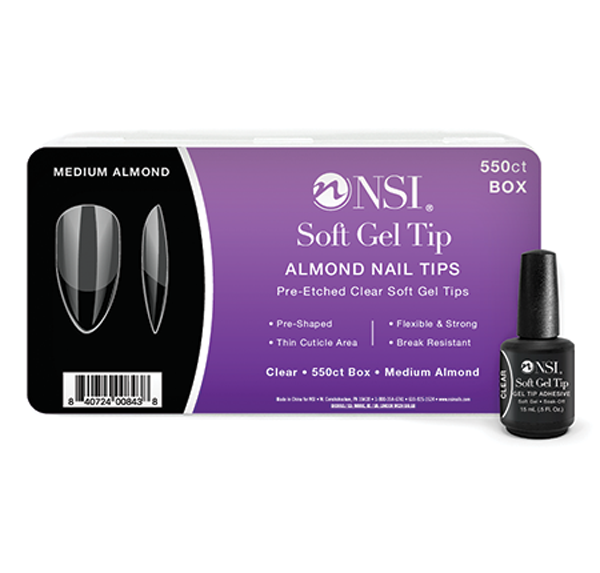 The NSI Soft Gel Tips System effortlessly creates strong beautiful nail enhancements without sculpting. Cut your service time in half with the NSI Soft Gel Tips. Now it’s as easy as picking your desired shape! Apply NSI’s Soft Gel Tip Adhesive and cure for 60 seconds.