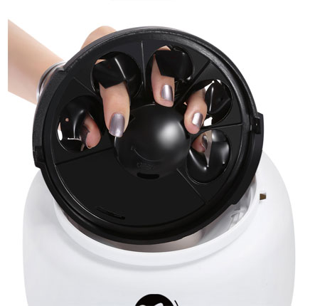 4. Now Insert your Fingers into the Black Finger Compartments and wrap your fingers around the inside dome, gripping and forming a circle position with your fingers slightly apart. You can, if you wish, also lower your fingers down into the solution in the bowl if you prefer, this does give a quicker option for very hard products such as Acrylics. “Also Start a Timer or take Note of the time on a clock”
